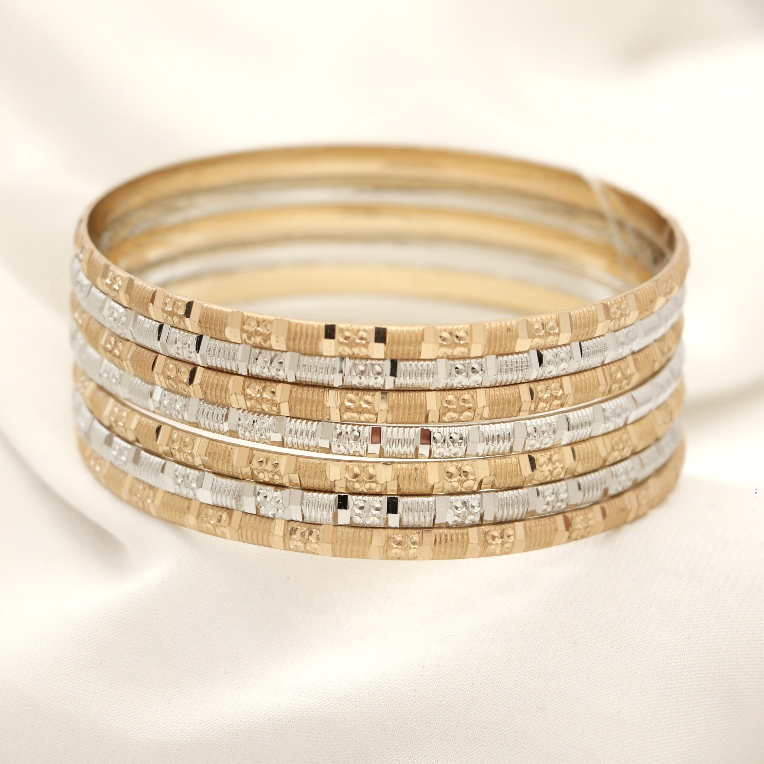 این النگو ها از برند معروف طلاروس می باشد و سطح کار روکش طلا و آبکاری طلای قوی دارد. پک های النگو به صورت 7 عددی میباشد و در قبال هزینه ی پرداختی 7عدد النگو 4 عدد طلایی و 3 عدد نقره ایی برای شما ارسال میشود. برای ماندگاری بالاتر کارها لطفا مطابق کارتی که داخل بسته بندی ارسال میشود اقدام کنید. عکس این محصول بدون هیچگونه فیلتر میباشد و در نور طبیعی انجام شده است که بسیار شبیه رنگ نمونه طلای النگوها میباشد. آماده سازی و ارسال تمامی محصولات بعد از2 روز کاری بدون احتساب روز تعطیلی میباشد.