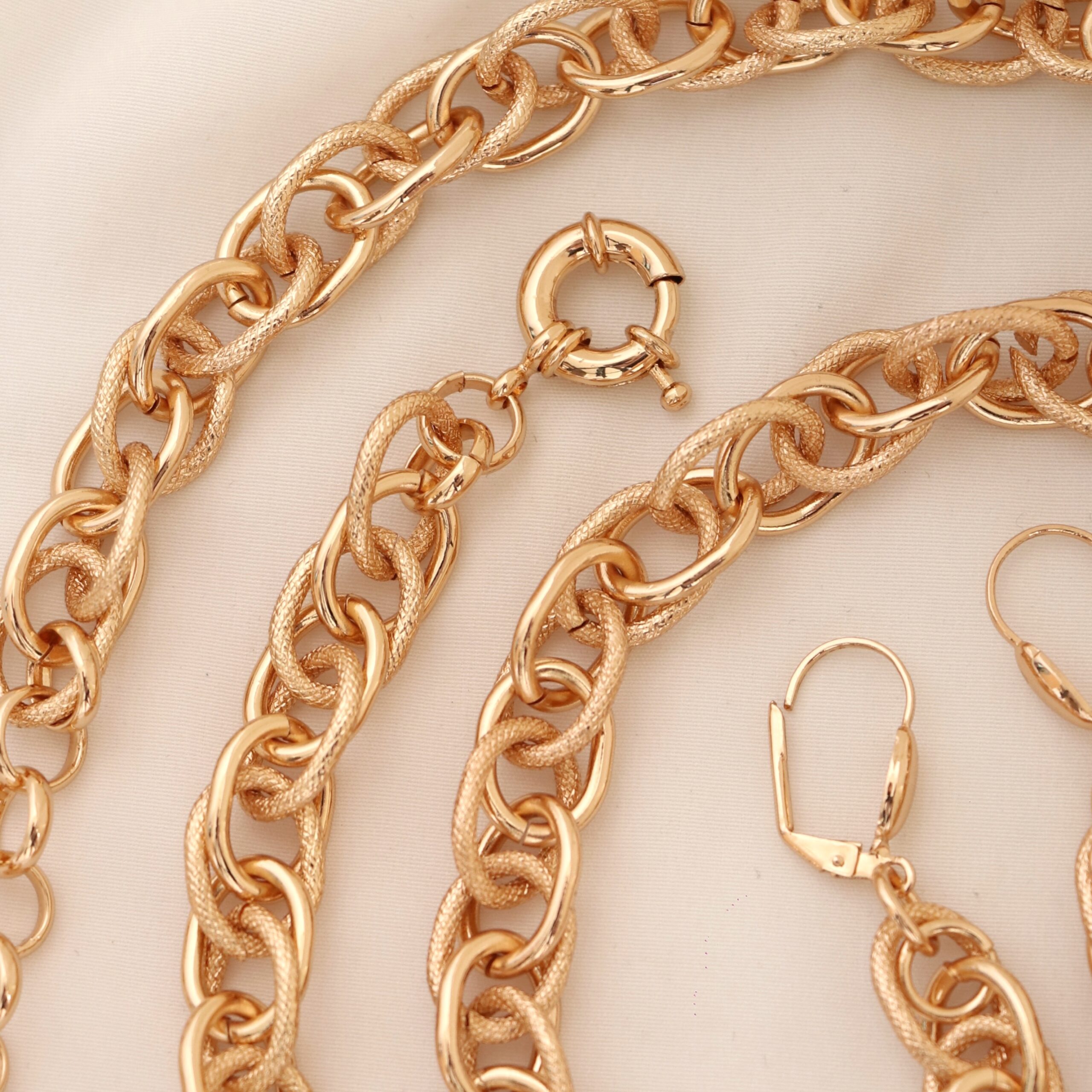 این سرویس از برند معروف دریم می باشد و سطح کار روکش طلا و آبکاری طلای قوی دارد. سرویس شامل گوشواره، گردنبند ، دستبند میباشد .برای ماندگاری بالاتر کارها لطفا مطابق کارتی که داخل بسته بندی ارسال میشود اقدام کنید. عکس این محصول بدون هیچگونه فیلتر میباشد و در نور طبیعی انجام شده است. آماده سازی و ارسال تمامی محصولات بعد از2 روز کاری بدون احتساب روز تعطیلی میباشد.