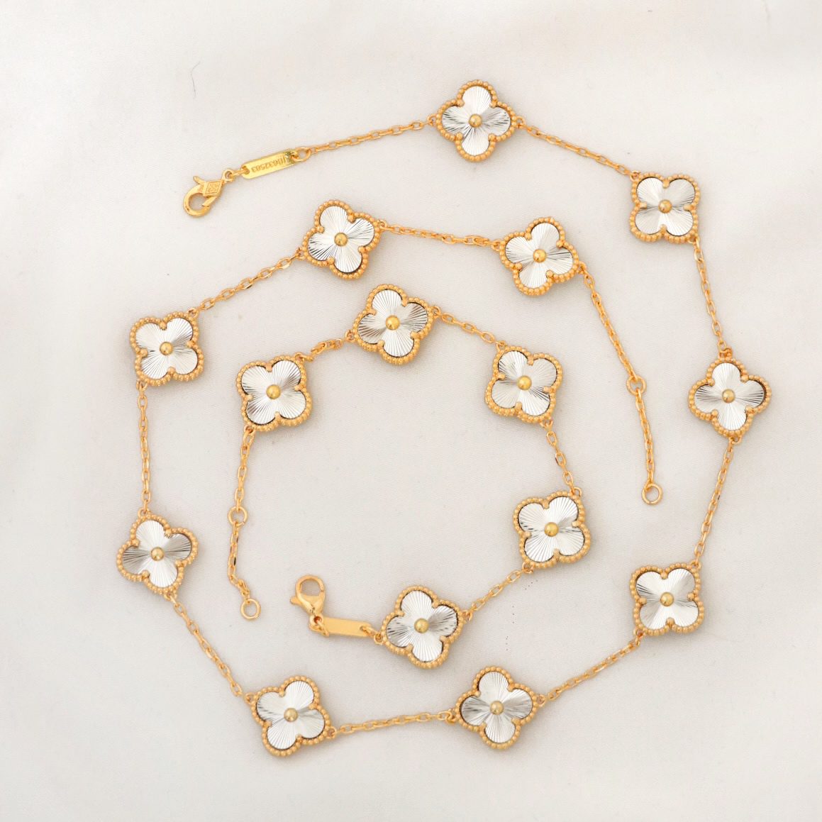 گردنبند و دستبند ونکلیف مسترکپی از نمونه اورجینال ، سطح کار روکش طلا و آبکاری طلای قوی دارد ، دستبند تا سایز 3 اندازه میشود.برای ماندگاری بالاتر کارها لطفا مطابق کارتی که داخل بسته بندی ارسال میشود اقدام کنید. عکس این محصول بدون هیچگونه فیلتر میباشد و در نور طبیعی انجام شده است. آماده سازی و ارسال تمامی محصولات بعد از2 روز کاری بدون احتساب روز تعطیلی میباشد.